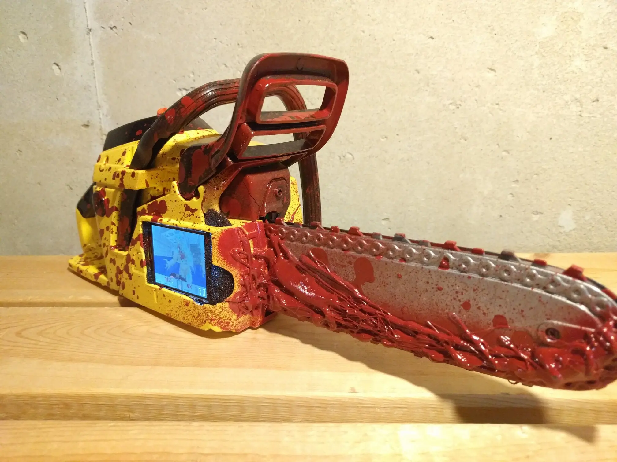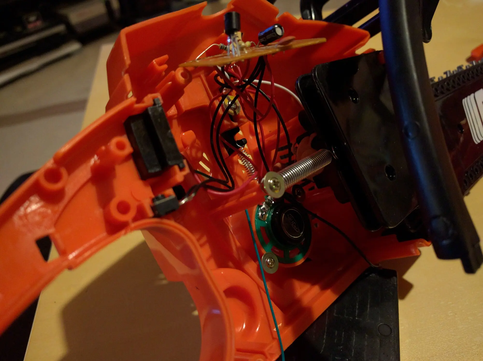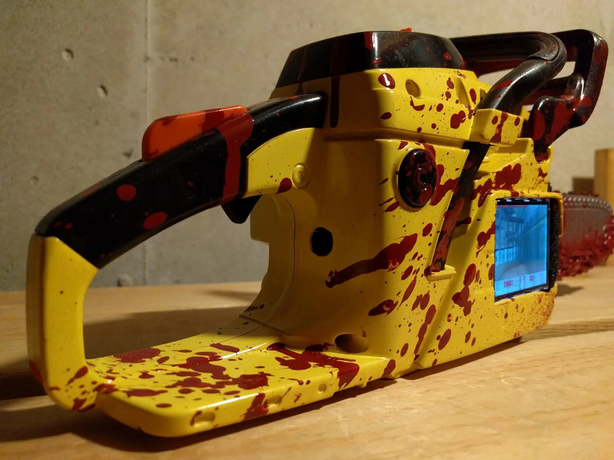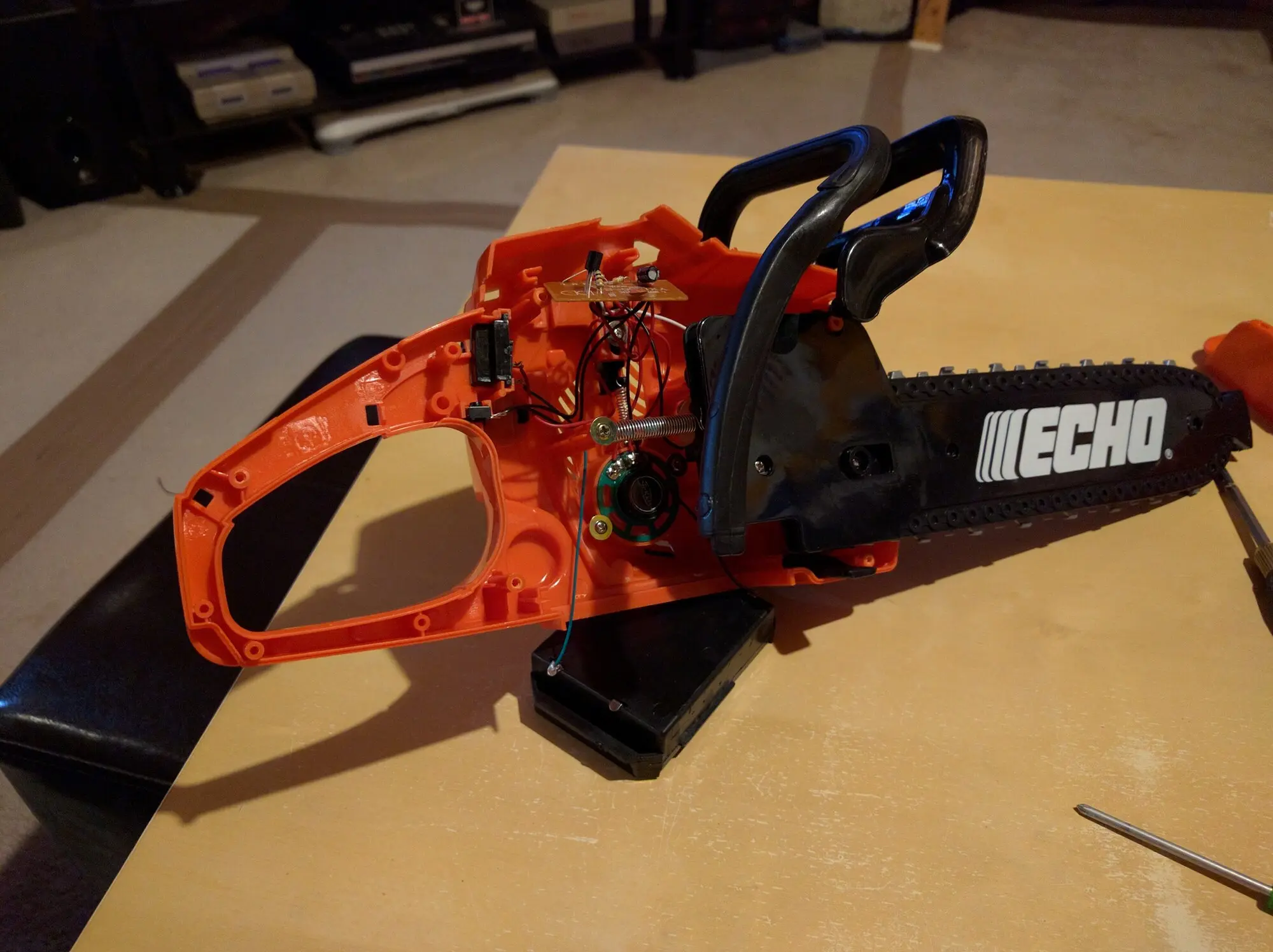 It’s a hack, a modded Echo Junior Chainsaw toy which actually had pretty neat working internals. While I wish I could have kept them, there was a small motor which drove the rubberized chain ‘blade’, and a speaker with (albeit, heavy aliased) sound effects from a gasoline chainsaw that revved up the longer you held the trigger down. The trigger even had a working safety, and I was able to keep that, but it’s not wired up to a button any longer.