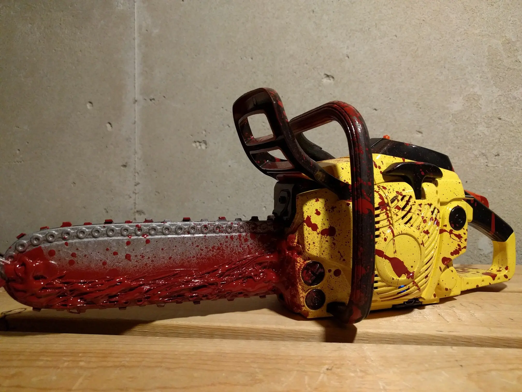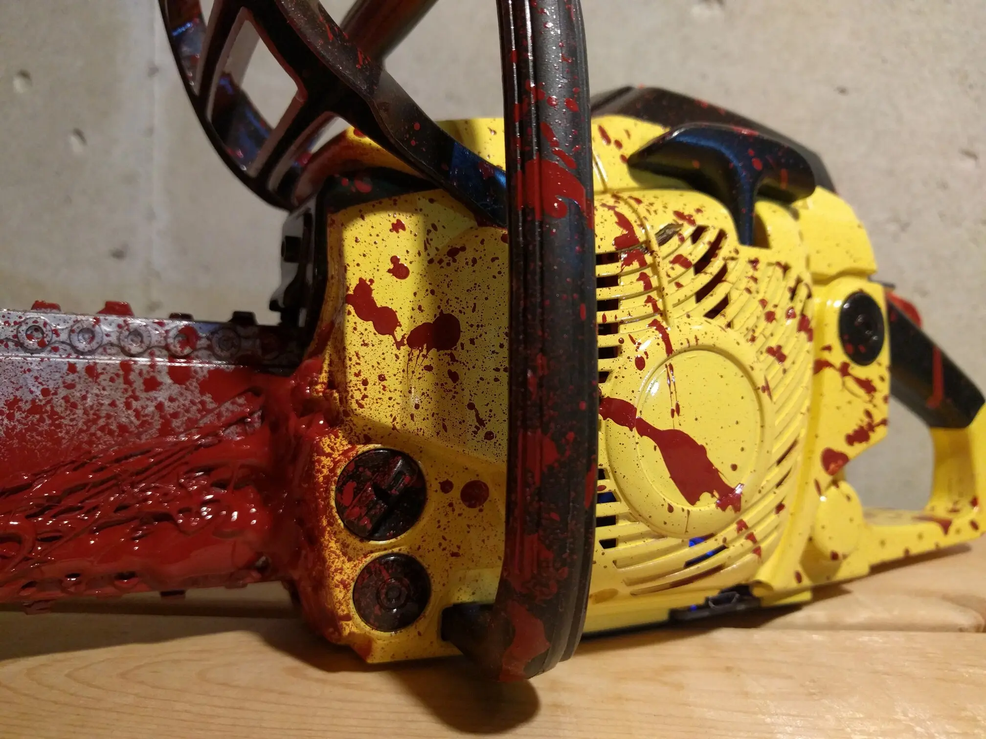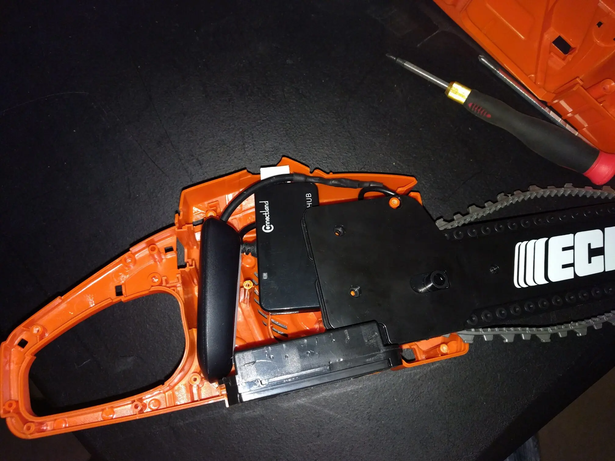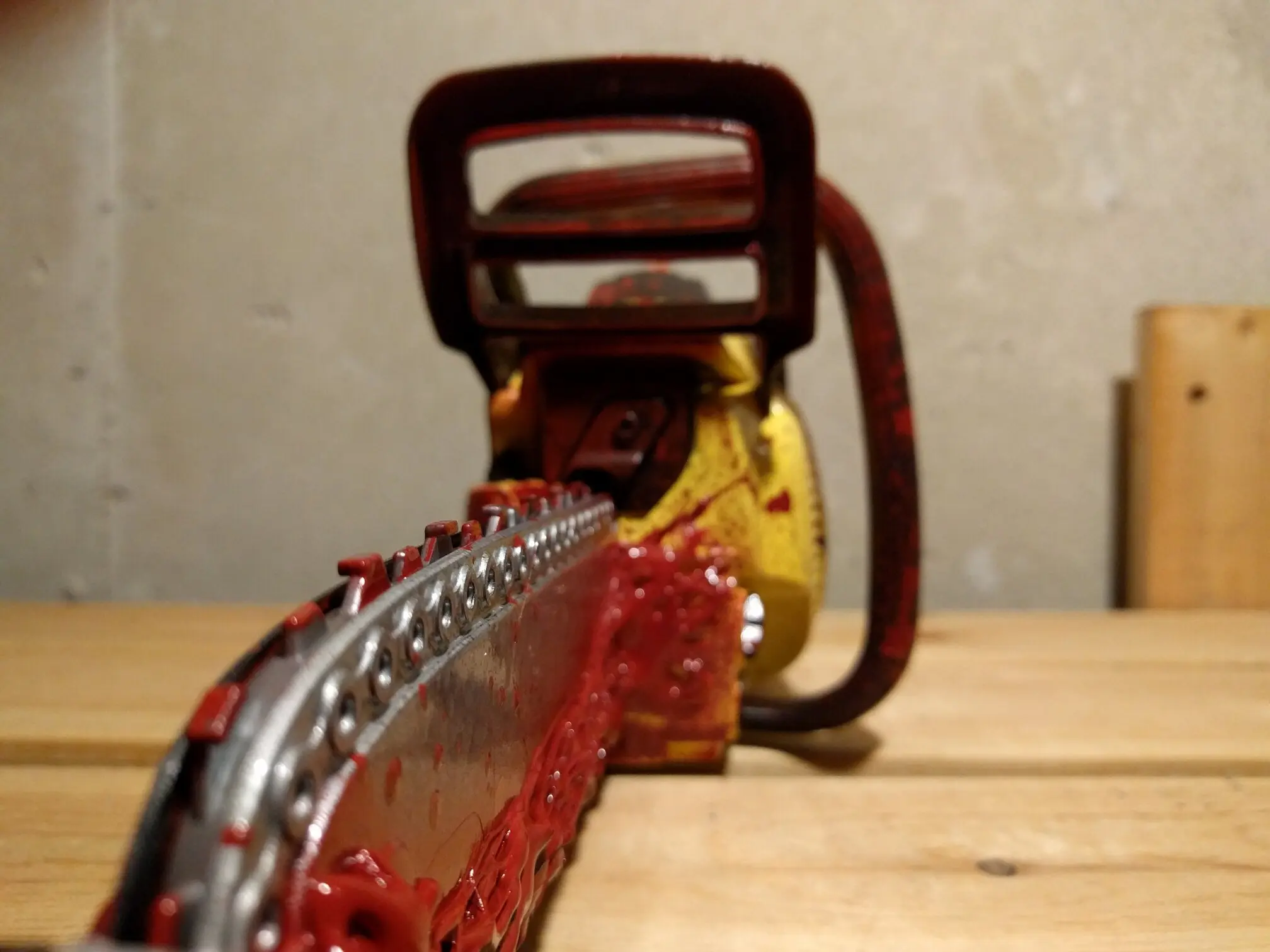 It’s a hack, a modded Echo Junior Chainsaw toy which actually had pretty neat working internals. While I wish I could have kept them, there was a small motor which drove the rubberized chain ‘blade’, and a speaker with (albeit, heavy aliased) sound effects from a gasoline chainsaw that revved up the longer you held the trigger down. The trigger even had a working safety, and I was able to keep that, but it’s not wired up to a button any longer.