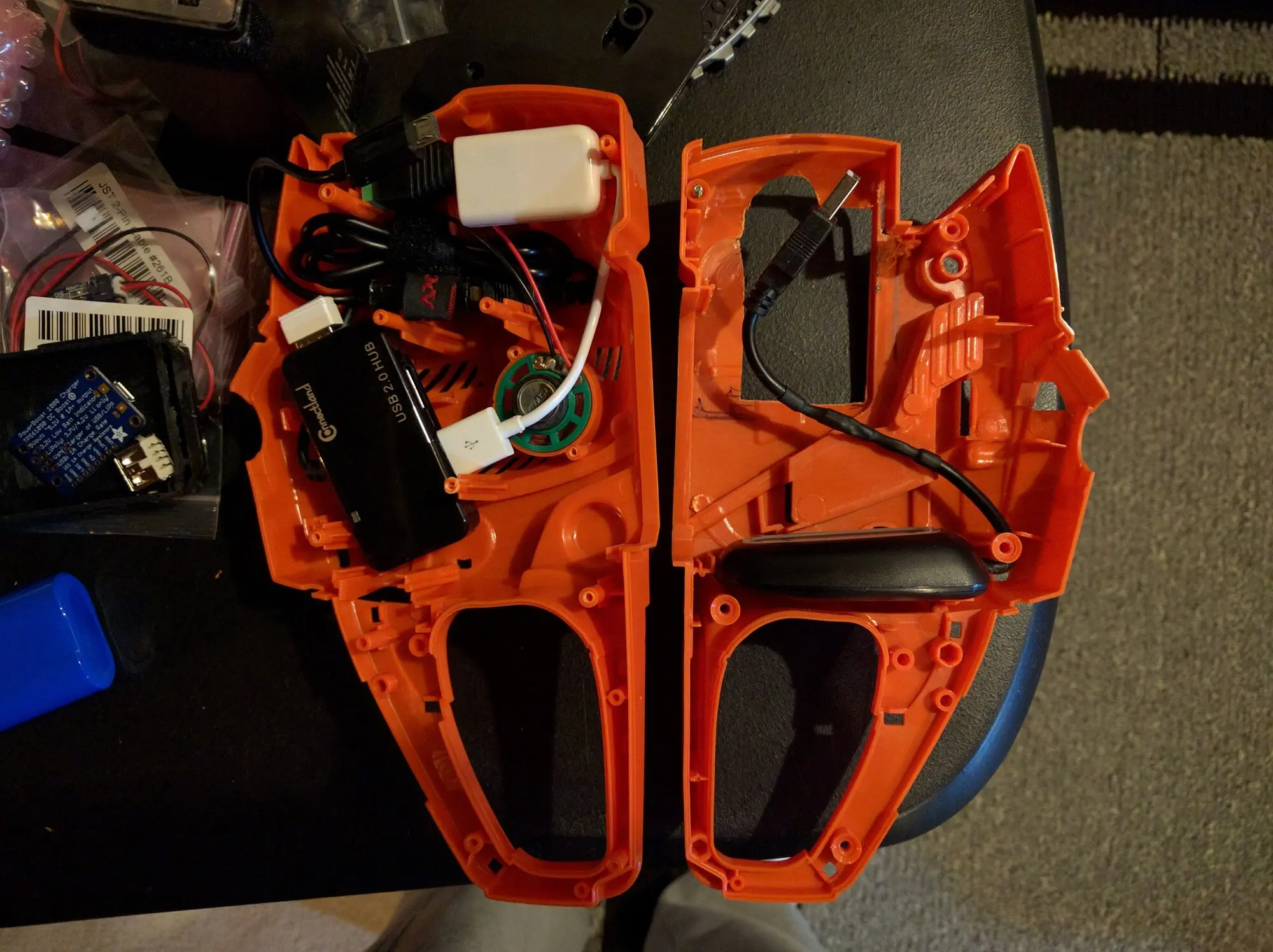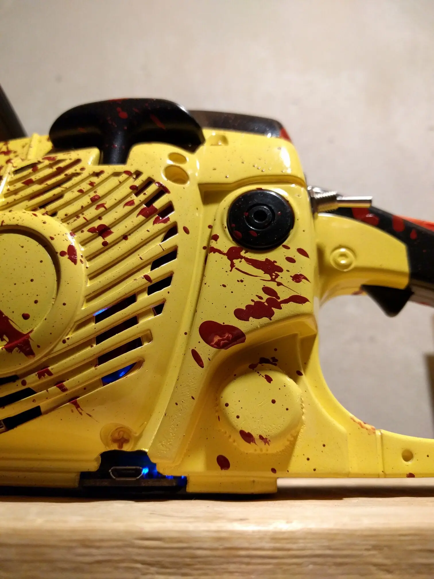 The X360 USB receiver is within the body of the chainsaw, but there is a hole near the handle which gives access to the pairing button, so you can use any X360 controller. The Adafruit PowerBoost 1000 Charger is also positioned to allow for charging the battery via its Micro USB port, located the the bottom of the painsaw.